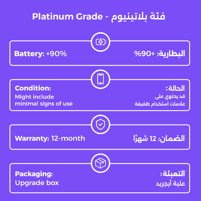 إذا كنت ترغب في أداء ممتاز وهاتف قريب جدًا من الحالة الجديدة مع آثار استخدام بسيطة جدًا، فاختر فئة البلاتينوم. فهي مزيج من التوازن المثالي الذي يجمع بين الجودة والسعر.