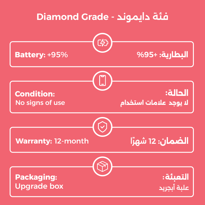 إذا كنت تبحث عن هاتف يبدو وكأنه جديد تمامًا، مع أعلى نسبة بطارية ودون أي آثار استخدام، ففئة دايموند هي الخيار المثالي لك. فهي مناسبة لمن يرغبون في تجربة فاخرة دون أي تنازلات.